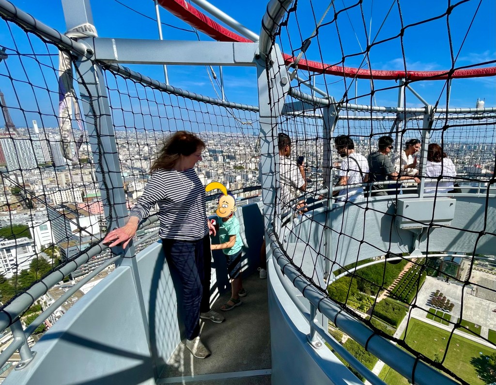 Ce ballon captif, qu’on appelle montgolfière parce que cela sonne mieux, permet de s’élever à 160 mètres et de contempler Paris et la Tour Eiffel d’où la vue est infiniment meilleure car non obstruée par les affreuses tours du front de Seine. Mais, ne boudons pâs notre plaisir, l’impression de voler est bien là et on se sent dans la peau de Phileas Fogg.