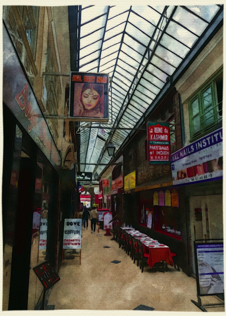 Mais il existe un autre groupe de passages, partant de la rue Montorgueil et finissant rue du Faubourg Saint Denis. Ce sont des passages plus bruts, moins connus, moins luxueux. Certains sont délabrés et ont perdu leurs verrières, d’autres ont été investis par les Pakistanais, les Indiens, les Africains qui leur donnent une vie nouvelle, aux limites du magique. Le passage du Grand Cerf est dédié à l’artisanat chic, le passage du Caire est levantin et ouvre sur les boutiques de mode des Pakistanais. Puis on trouve les coiffeurs Africains. Tout s’achève avec le passage Brady qui nous envoie dans le monde des restaurants indiens.
