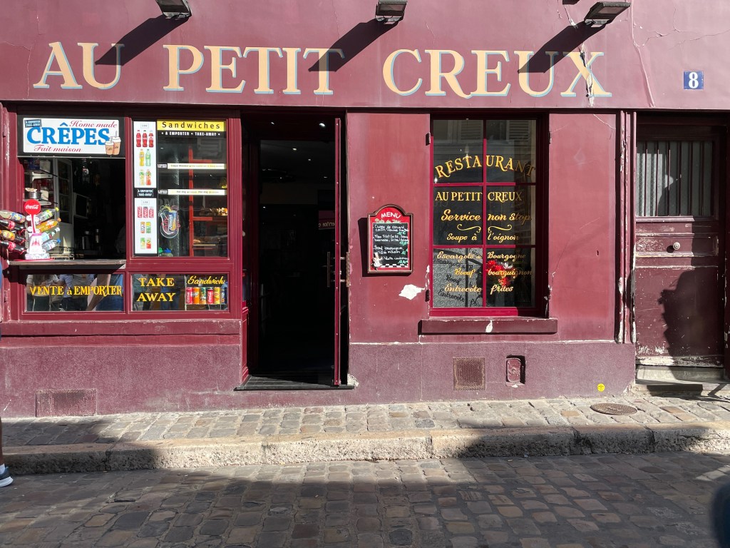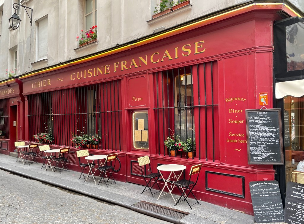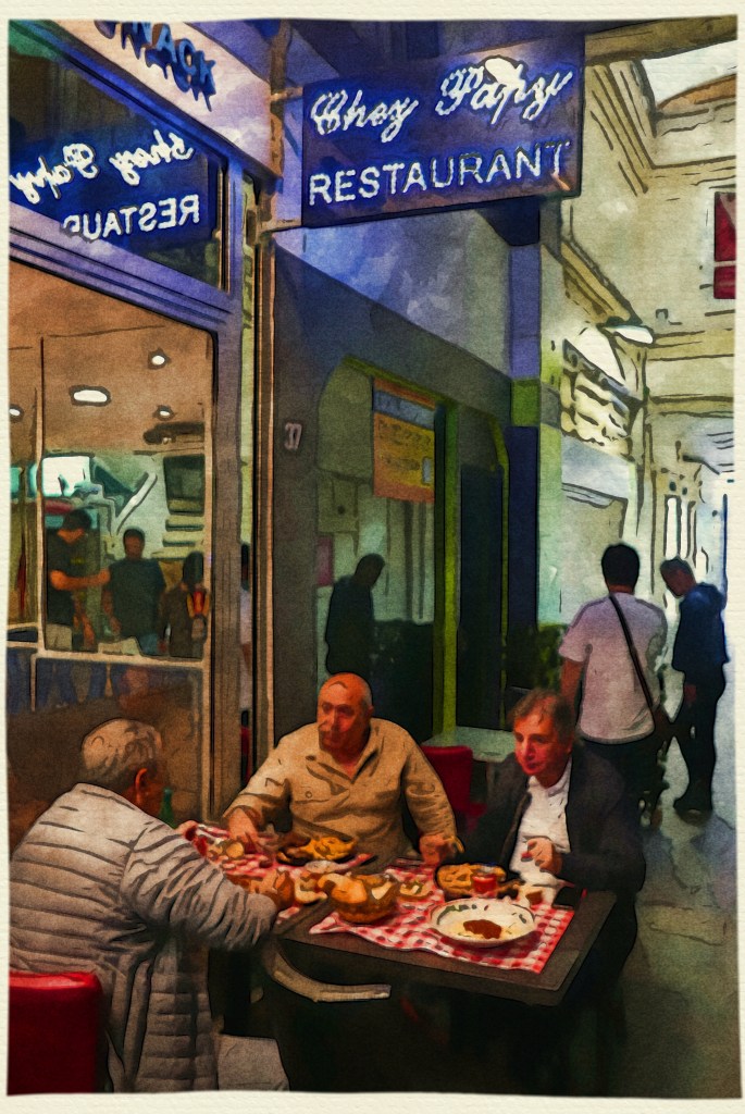 Impossible de réserver, impossible de négocier sa place. Il fallait arriver à temps, ou bien faire la queue dehors en attendant qu’une table se libère, au fil du service expéditif du restaurant. Chaque centimètre carré du restaurant était exploité, les clients serrés autour de petites tables, avec de petites assiettes, des petits verres dans un brouhaha incessant. On déjeunait au milieu du ballet des serveuses apportant les grands plats de viande et les montagnes de frites.