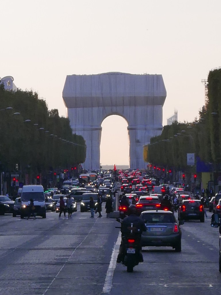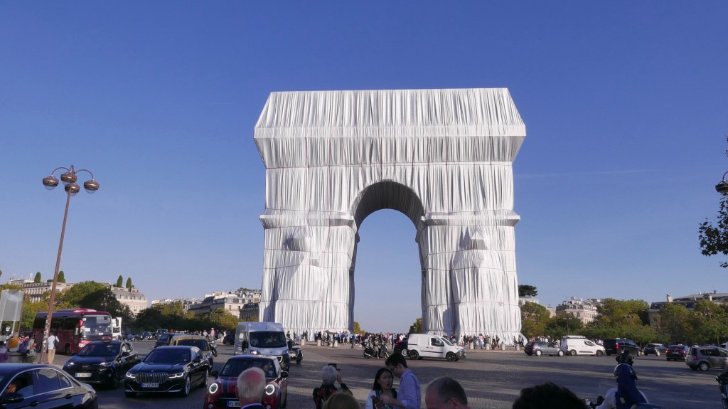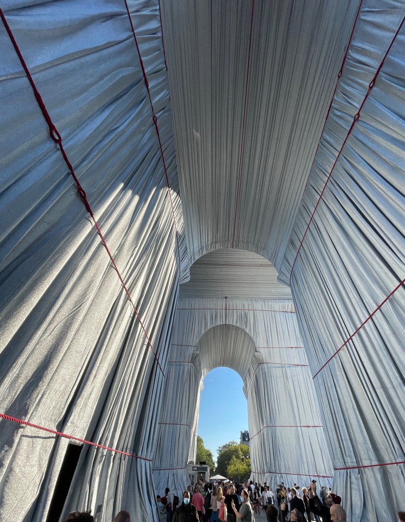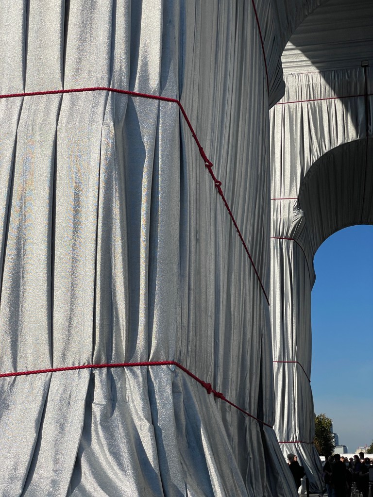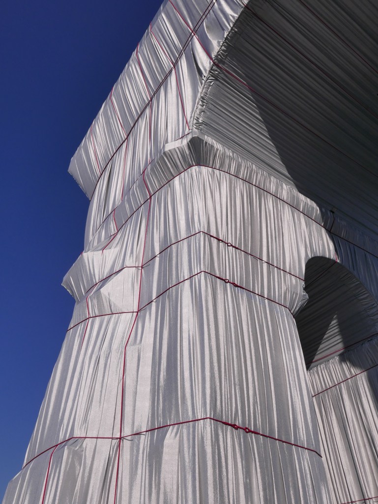 Il y a bien longtemps, nous avions pu admirer le Pont Neuf habillé d’or par Christo. Aujourd’hui, nous avons été saisi par cet Arc de Triomphe habillé de d’argent aux relets bleus ligoté de cordes rouges et surgissant sur le ciel de Paris.