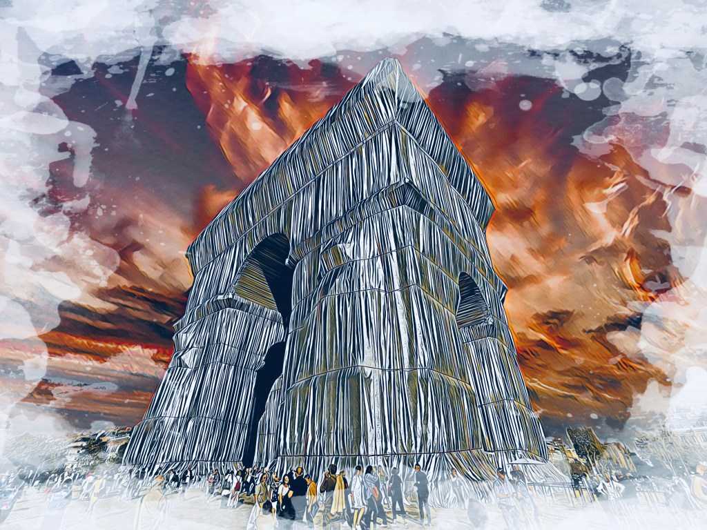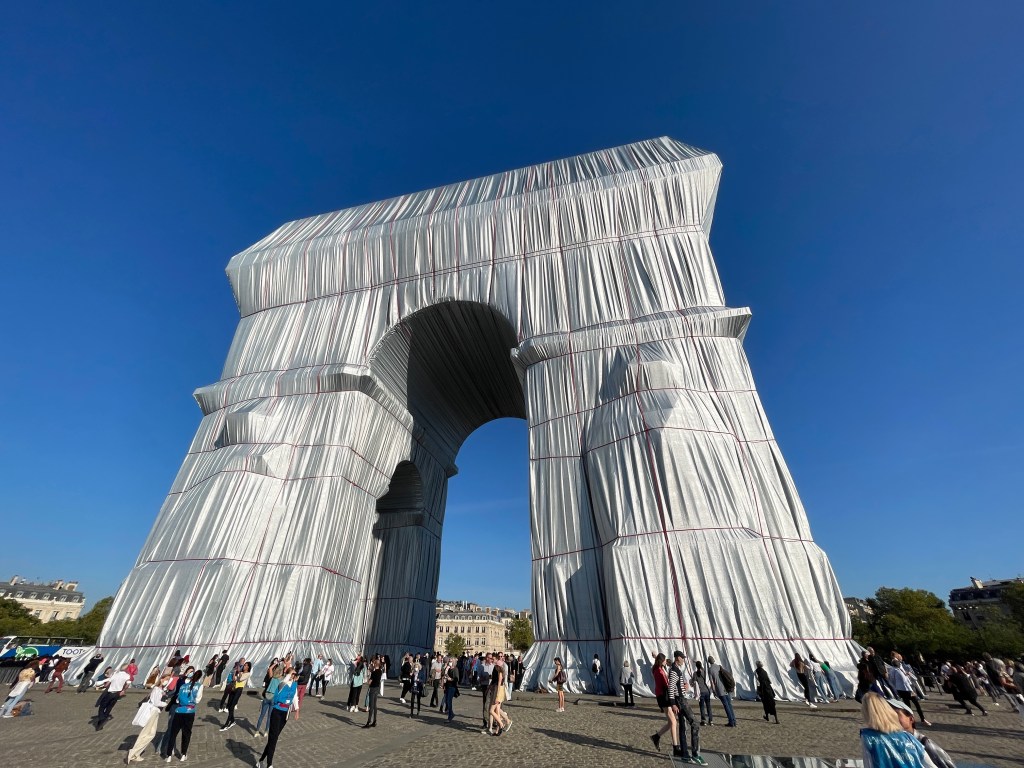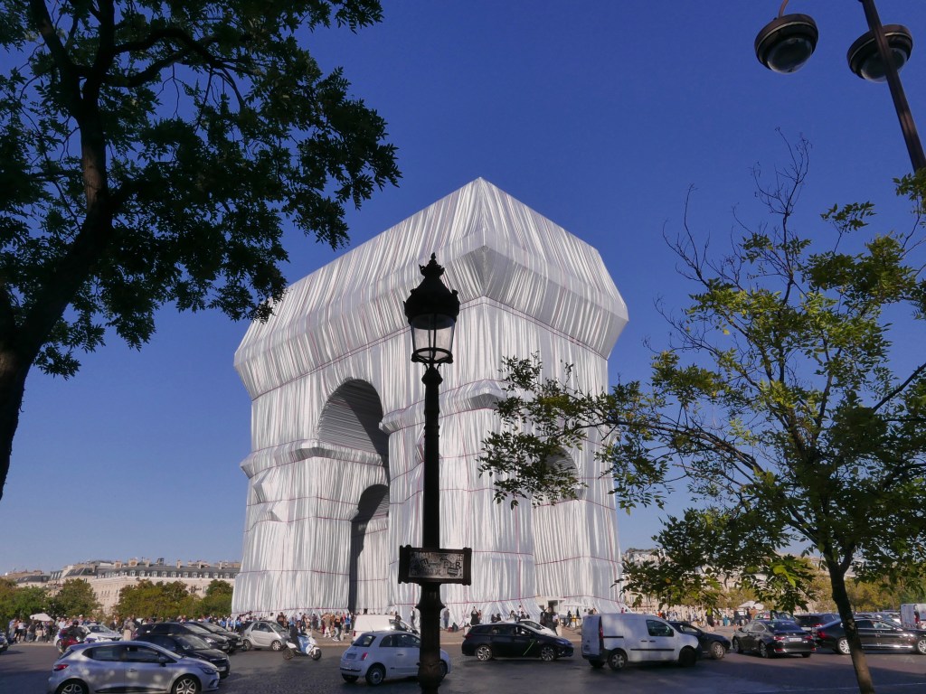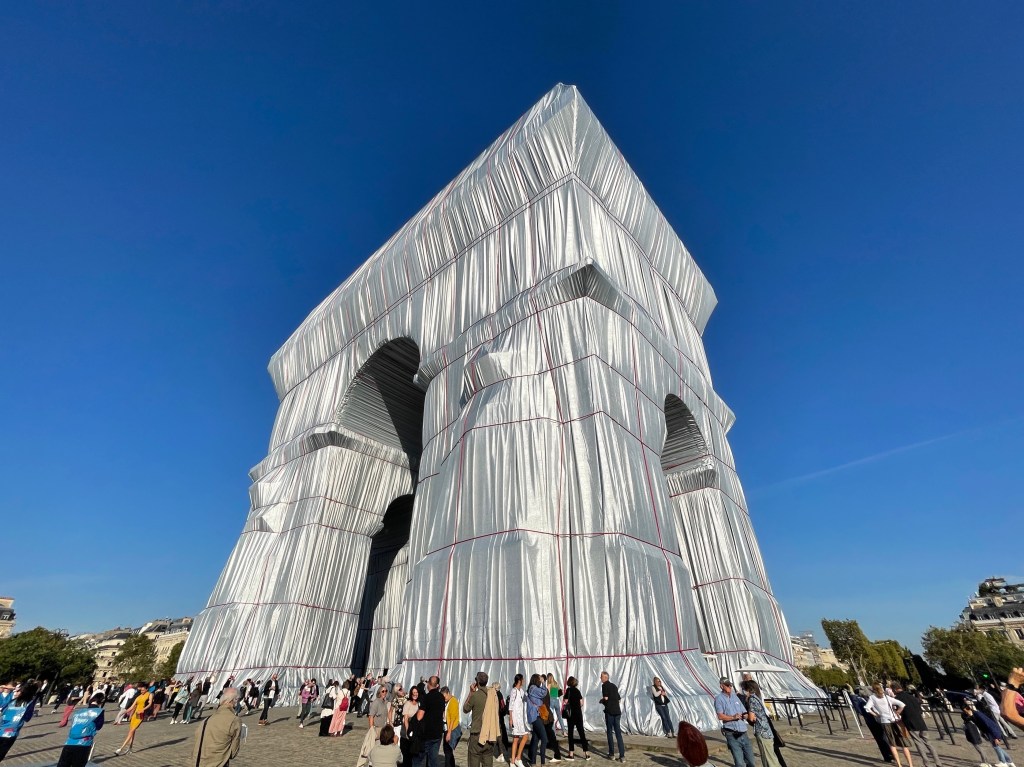 Il y a bien longtemps, nous avions pu admirer le Pont Neuf habillé d’or par Christo. Aujourd’hui, nous avons été saisi par cet Arc de Triomphe habillé de d’argent aux relets bleus ligoté de cordes rouges et surgissant sur le ciel de Paris.