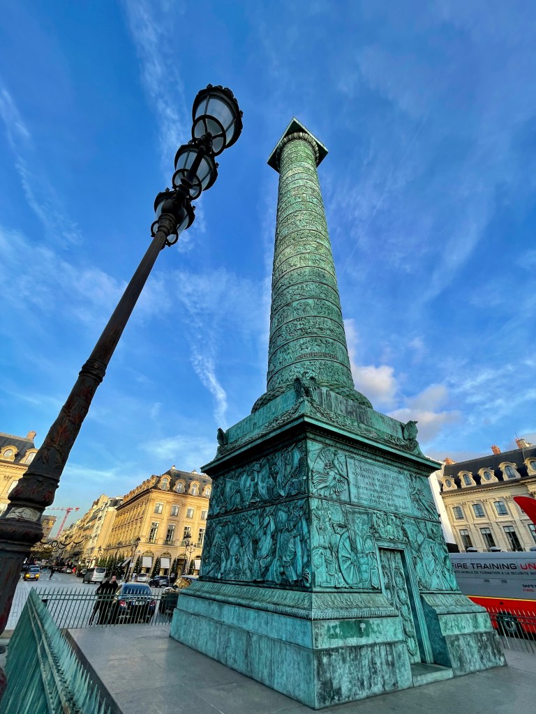 La Place Vendôme pavée de marbre, c’est vraiment chic. On peut même aller jusqu’au pied de la colonne.