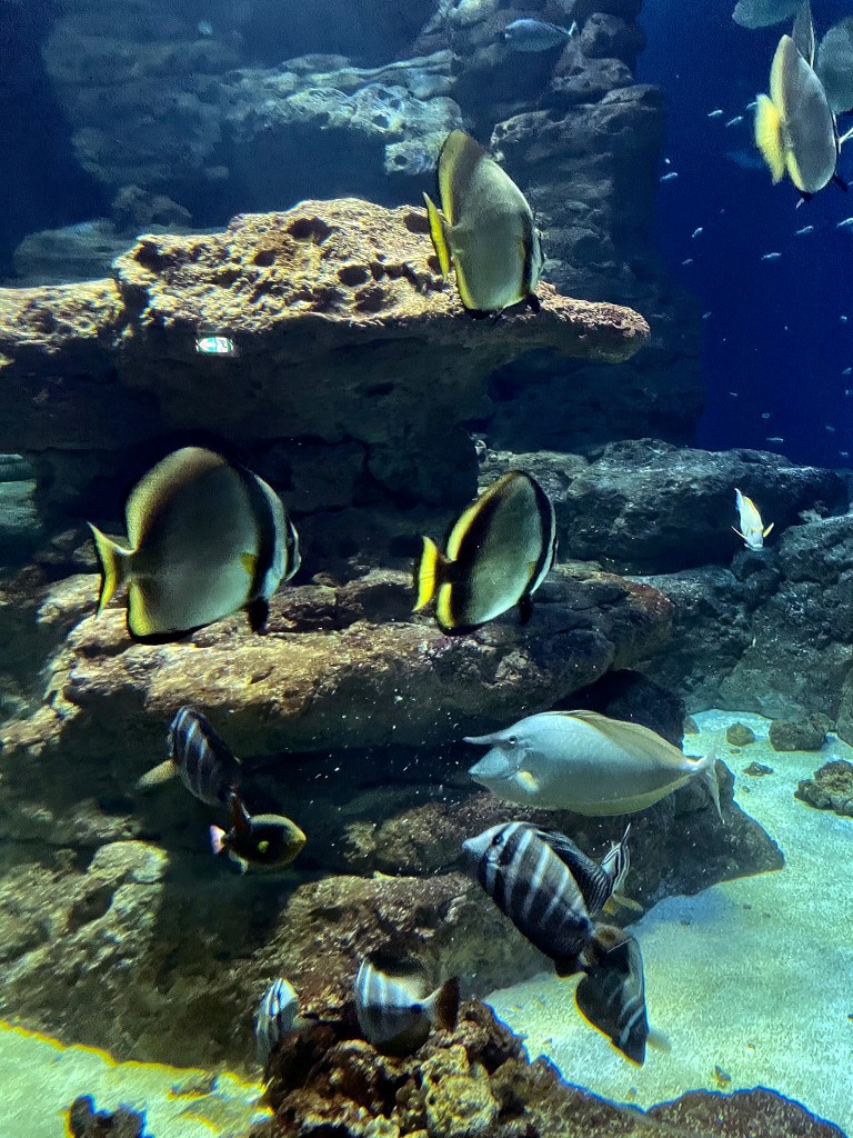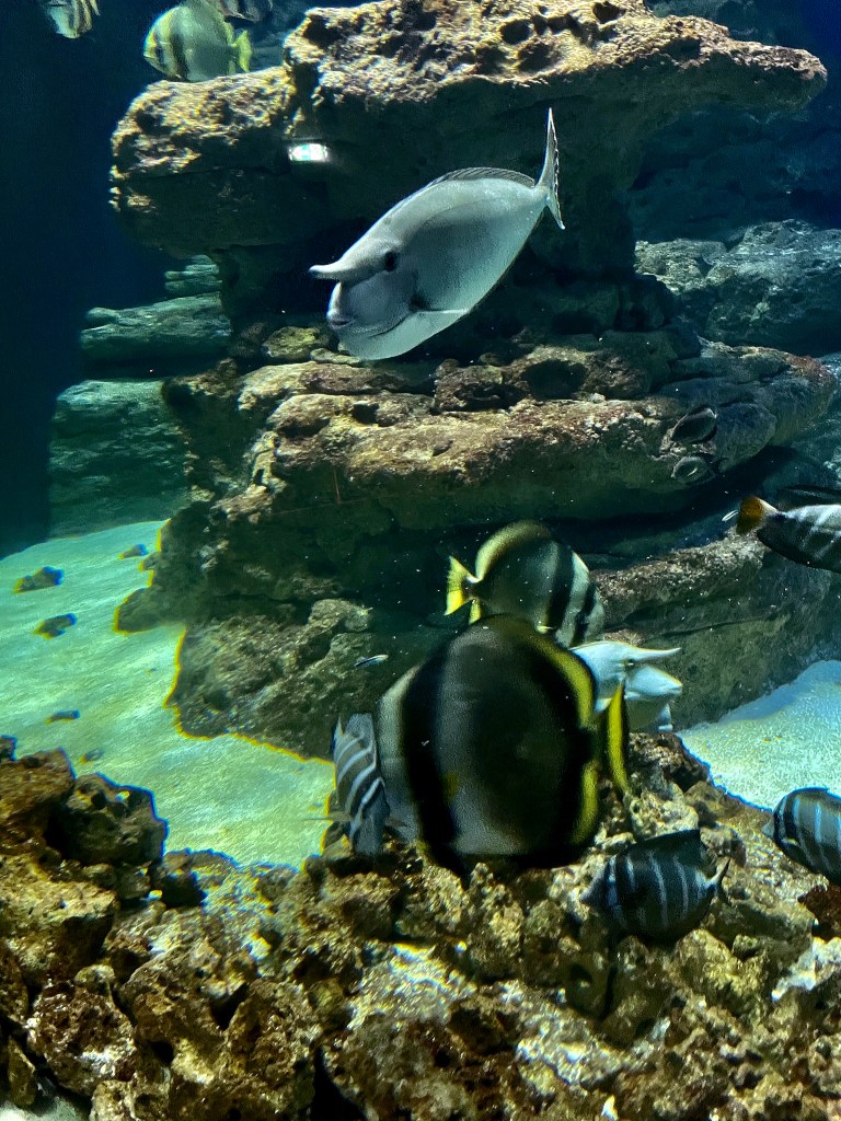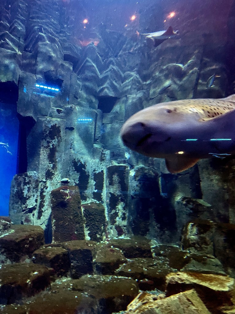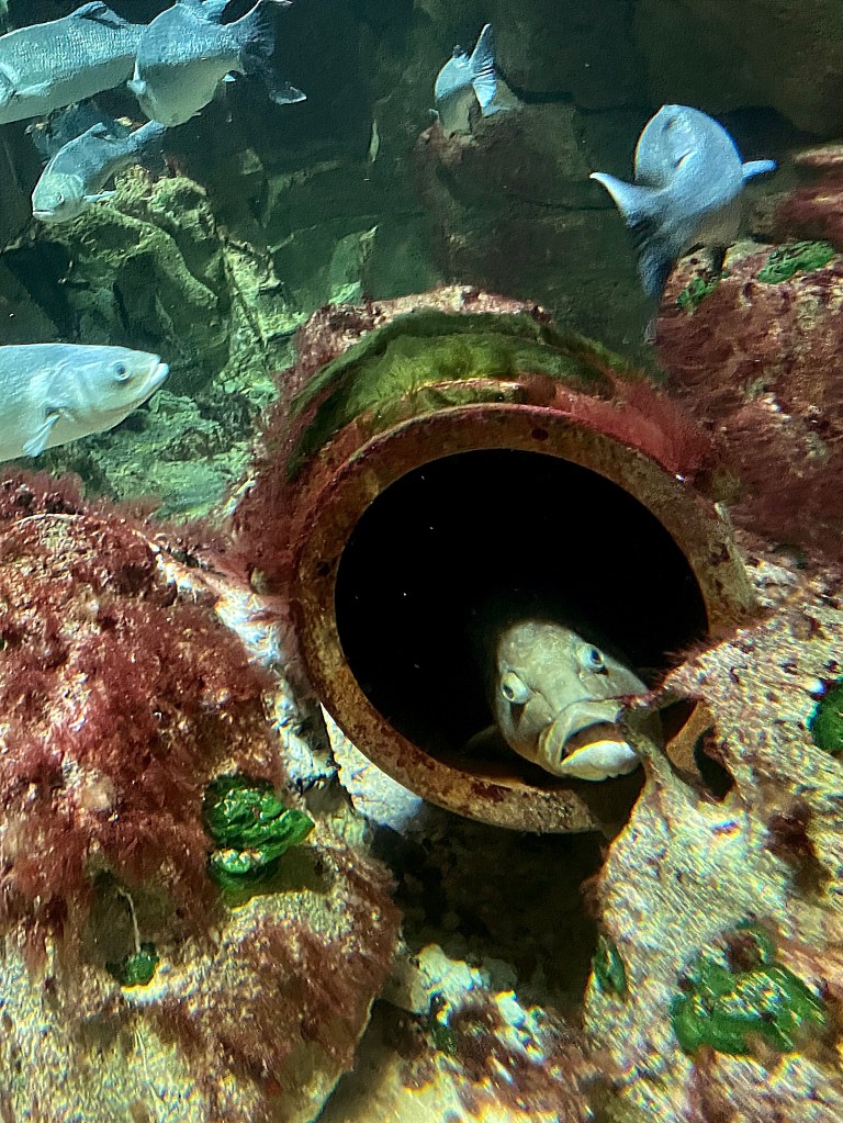 Il y fait très sombre et les murs sont percés de grandes vitrines qui permettent d’admirer des poissons et des animaux marins de toutes les couleurs. Les poissons font toujours la gueule et l’endroit est bondé de gosses surexcités.